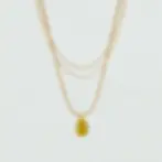 Collar corto acabado en oro, con tres cadenas y un colgante central de resina en forma de gota. Es una joya 3 en 1, ya que todas las cadenas son de quita y pon. Una joya muy versátil y muy fácil de combinar, que aporta un toque chic para hacer brillar cualquier outfit. Esta joya mide 375 mm con un alargo extra de 50 mm